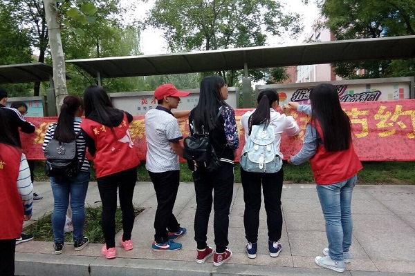 为了响应团委勤俭节约的号召,为了让广大师生厉行节约杜绝浪费,9月11日中午,北校区青年志愿者协会携手广播电台在餐厅北门举行了“光盘行动”。