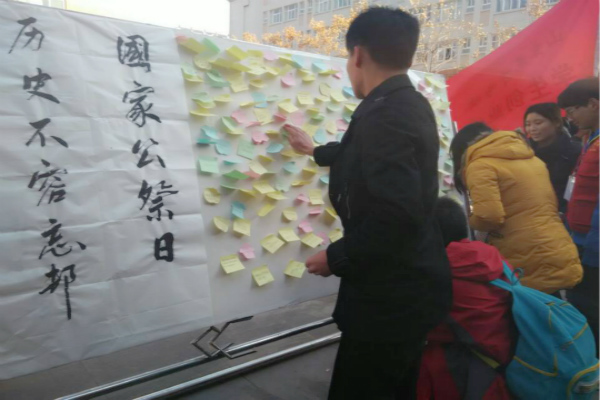 为同胞默哀,为中华祈福。今天2014年12月13日,是首个南京大屠杀死难者国家公祭日。山东英才学院青年志愿协会在大学生活动中心展开以“国家公祭日,历史不容忘却”为主题的爱国活动。活动中展示了广大青年的人文精神和民族性格。