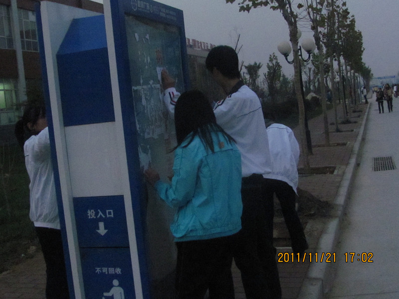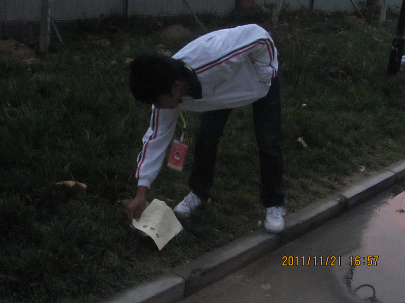 下午四点四十分,全体的部员及部分会员身着校服整齐的在图书馆东门集合完毕后,由各部长分别带领到各自打扫的区域,打扫活动井然有序的开始了,活动中,每个志愿者都很有干劲,不放过任何一个卫生死角,在垃圾箱附近,一张张“顽固”的野广告纷纷被志愿者们撕下来。夜幕降临,温度渐渐降低,好多志愿者手已冻的发红,但志愿者们没想过退缩,把每一个角落都打扫的干干净净,把最美的校园展现给大家。最后活动圆满结束。