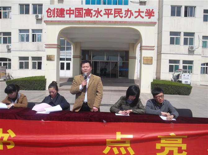 3月30日中午,山东英才学院青年志愿者协会、院学生会、院广播站在A楼广场举行了“同读一本书,点亮小桔灯”爱心捐书活动启动仪式。院团委龙新良书记、王东生副书记、团委办公室主任何岩老师、团委志工部部长王坤丽老师、广播站指导老师王建洲等领导出席活动并发表重要讲话。