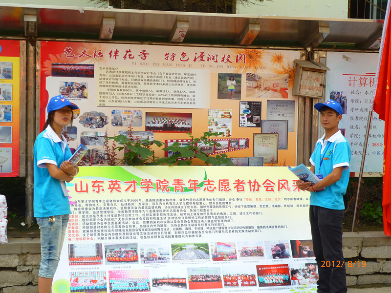 2012年8月19日,山东英才学院青年志愿者协会在大学生活动中心隆重举行了新学期的招募活动。这次招募将为我们青年志愿者协会注入新鲜的血液,更好的增强协会的活力,展现协会的风采,使“奉献,友爱,互助,进步”的志愿者精神在我校得以继承和发扬。