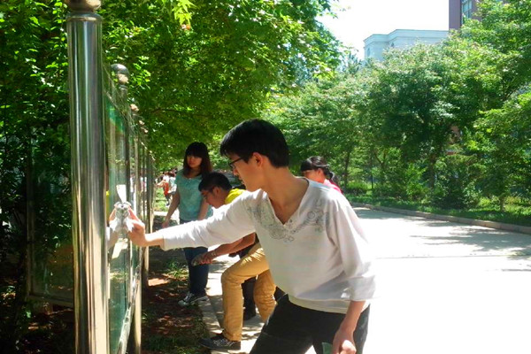 此次活动中,志愿者们都积极参与,自带卫生工具,他们分成几个小组,每个小组负责一个区域,每人都顶着炽热的阳光,认真细致地对宣传栏进行清理,坚决不放过任何一个卫生死角,为了让宣传栏更干净,让校园更加美好,志愿者们拿来旧报纸,再一次对宣传栏玻璃进行清洁。大约一小时后,宣传栏焕然一新。