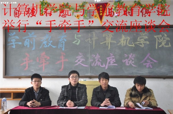 2010年12月13日中午,计算机学院与学前教育学院在A楼5006举行“手牵手”交流座谈会。出席此次会议的有计算机学院与学前教育学院基层团委、学生会常务副书记、主席团及各部部长。本次会议由学前教育学院基层团委副书记、学生会主席曹鹏主持。