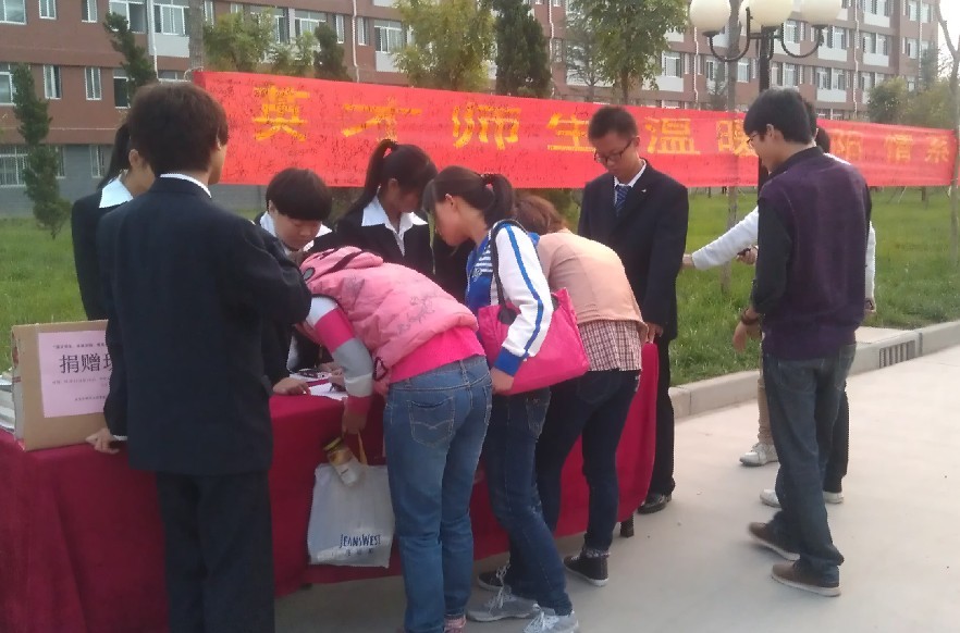 2011年10月12日 ,由经济管理学院基层团委、学生会策划室主办的“情暖济阳”大型爱心捐赠活动在经过前期走访调研和宣传工作之后,物品捐赠活动于今天中午在宿舍楼十字路口正式开始。