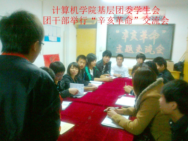 2011年10月18日晚上七点半,计算机学院基层团委学生会团干部组织召开纪念“辛亥革命”100周年主题得交流会。会议由学生会记者团部长钟洪波主持。