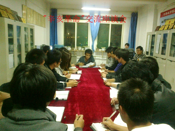 在交流座谈会上,09级、10级团干部们查阅辛亥革命年相关资料进行讨论,然后就胡锦涛主席在纪念“辛亥革命”100周年的重要讲话进行学习并总结。辛亥革命是1911年中国爆发的资产阶级民主革命,清王朝日益腐朽,帝国主义侵略进一步加深,为了推翻清朝的专制统治,挽救民族危亡,争取国家的独立、民主和富强, 孙中山 先生带领革命团体掀起了辛亥革命。这次革命结束了中国长达两千年之久的君主专制制度,是一次伟大的革命运动。历史是一面镜子,也是一部教科书。从1911年秋天武昌城头震惊世界的一声枪响,到今天中国大地日新月异的现代化图景,辛亥革命以来的百年巨变,蕴含丰富历史启示,具有深刻现实意义,标明了走向未来的前进方向。