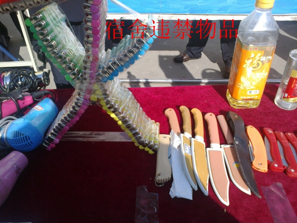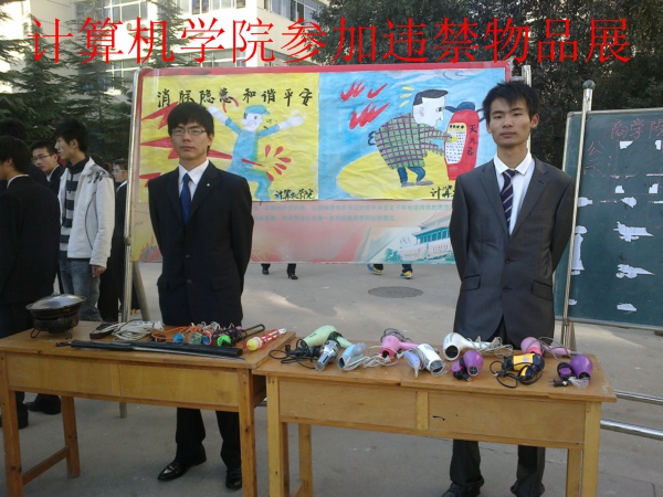 计算机2011年10月25日9点左右,由山东英才学院学生处宿管会学院积极响应院学生处的号召,将在宿舍收缴的各种违禁物品就此展示出来,被收的违禁物品中有电吹风、酒精灯、大刀、电锅等。在院学生处的领导下,各二级学院都展示各种违禁物品,宿管会在大活前面就违禁物品展进行安全宿舍签名仪式,得到大家的积极配合。