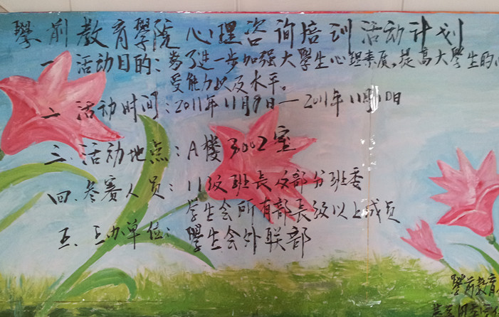 参加此次活动的有学前教育学院基层团委副书记兼学生会主席齐鹏、各个部长以及2011级各班班长。此次活动的目的是为了进一步加强大学生心理素质,培养大学生的自我心理保健意识。同时,学前教育学院学生会宣传部特意制作展板宣传本次活动,吸引了众多同学驻足观看,在观看中感受心理学的神奇魅力,拓宽了视野,增长了见识。