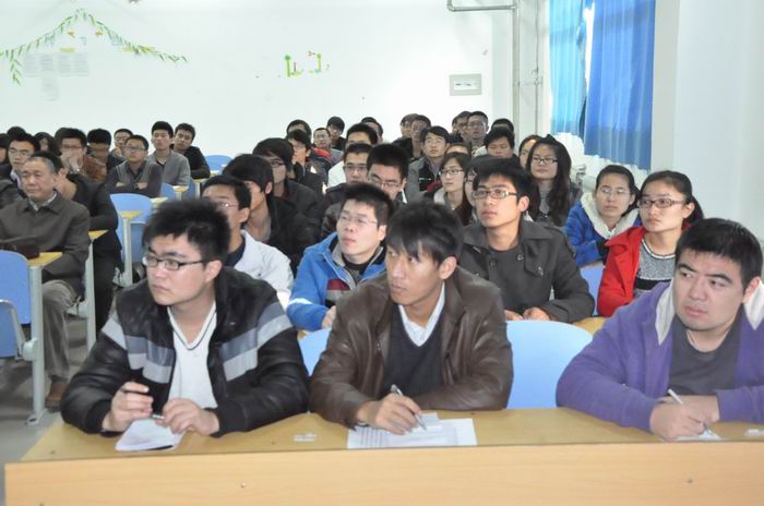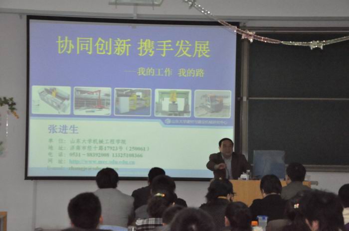 会议伊始,由刘院长隆重介绍张进生教授,随后张教授详细讲解了在机械这一领域的创新思路与方法,并以自身经历为基础,将创新与实用的思路融会贯通,对校企合作、集成创新及课题研发等进行了深入的分析,并积极引导广大学生在校期间应主动参与各项专业比赛,进一步开阔视野、打开思路,为日后的创新储备知识。台上风趣儒雅,台下掌声阵阵,张教授的演讲为广大师生上了生动的一课,受到了老师和学生的热烈欢迎。