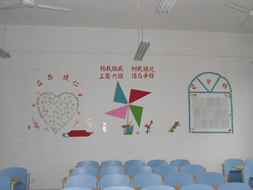 在教室卫生评比和教室装扮活动中,彰显出同学们积极向上的面貌,大部分的班级布置美观、整洁、大方、新颖。各班同学们把自己的愿望和梦想贴在教室评比栏上,激发了同学们的学习热情。“班主任寄语”、“心手相连”、“艺术天地”等板块的设计给同学们带来家的温馨。“商以富国,文以治国,理以强国”等字样体现出大学教室浓厚的文化气息,同时也具备了大学生应有的青春与活力。