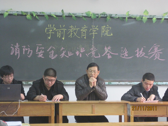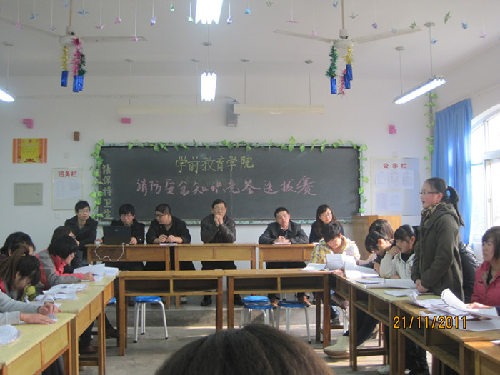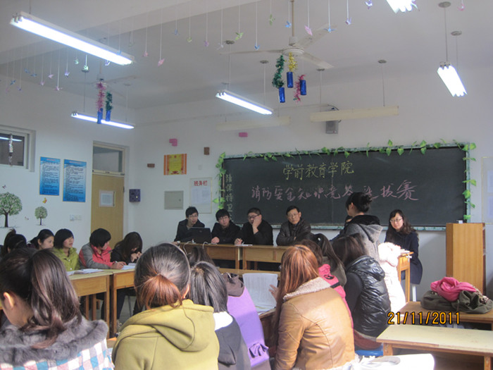 学前教育学院于 2011年11月20日 在教学楼A楼1004举行了学前教育学院消防安全知识竞答选拔赛,参加此次活动的有学前教育学院行政秘书 李根 老师,保卫处刘政委以及2011级各班辅导员老师和学生代表。
