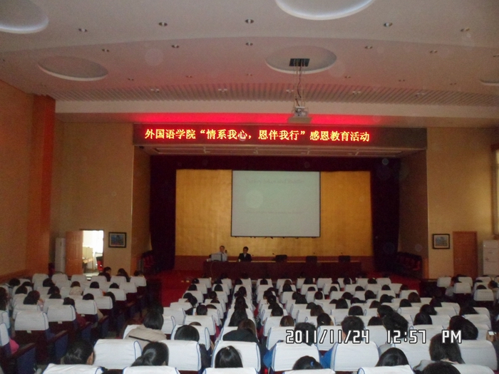 每年11月最后一个星期四是感恩节,感恩的气息充满整个英才学院。为了继承中华民族优良传统,加强对学生的思想教育,外国语学院基层团委于 11月24日中午 在学术报告厅组织了一场“情系我心,恩伴我行”为主题的教育讲座,根据本院专业特色,此次活动特邀请了外籍教师Martin用英文进行了宣讲。