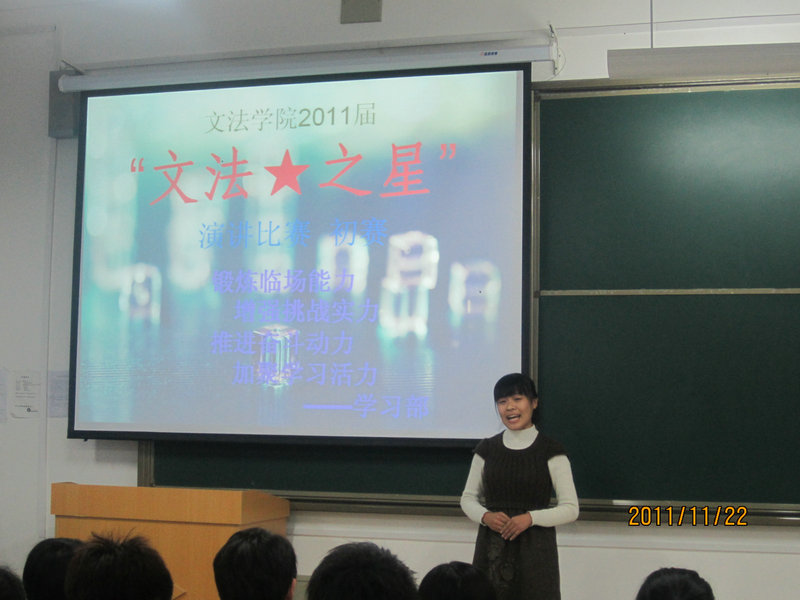 以“扁担,横竖都是一段人生,生活的支点,永远在我们的肩上”为主题的“文法之星”演讲比赛初赛,于2011年11月22日在山东英才学院北校区图书馆408教室举行。