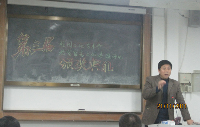 学前教育学院 2011年11月21日 在教学楼A楼1001举行了学前教育学院第三届校园文化艺术节及教室宿舍文化建设评比颁奖典礼。参加本次活动的有学前教育学院行政副院长李寿杰,行政秘书李根老师,2011级各班辅导员老师,学生会主席齐鹏,基层团委和学生会各部部长以及2011级各班班长和团支书。