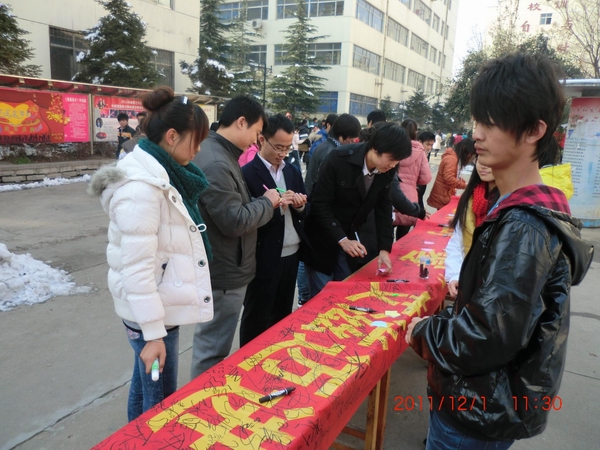 2011年12月1日 是世界第24个艾滋病日,在这个值得纪念的日子里,外国语学院基层团委于中午11:10在大学生活动中心前举行了一次以“行动起来,向‘零’艾滋迈进”为主题的签名活动。