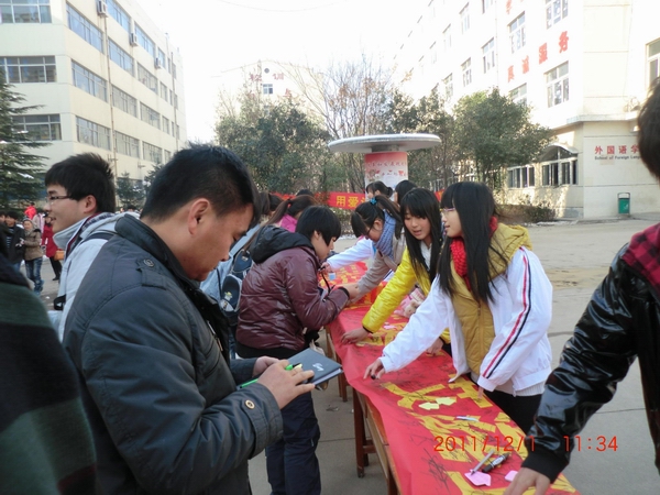 活动在凛冽的寒风中开始,工作人员在来往的人群中宣传这个日子,请更多的人参与进来。同学们虽然步履匆匆、饥肠辘辘,但是都愿意停下脚步,为这个活动添一份力、献一份心,风虽冷,但人情暖,越来越多的人参与到活动中。外国语学院行政副院长孙志峰、基层团委书记祝景朋和几位辅导老师也都留下寄语、送上祝福。这次活动持续了一个多小时,就在结束时还有人来签名祝愿,送上温暖。最后,全体工作人员为所有患艾滋病的孩子送上祝福,并准备后期制作vcr上传网上,让更多的人奉献一份爱心、送上一份祝愿,来鼓励不幸患上艾滋病的人,勇于面对生活。