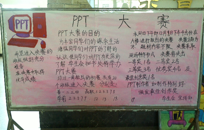 为了丰富同学们的课余生活,增强同学们对PPT的认识,使同学们对其有更深的了解。学前教育学院学生会秘书处于 2011年12月8日下午4点45分 在教学楼A楼大厅举行PPT大赛的总决赛,今日在A楼进行展板公示。