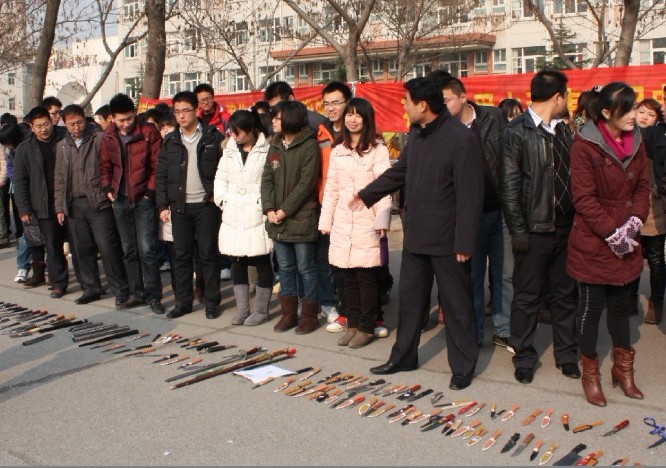 为落实学院消防安全月的通知精神,切实增强学生的消防安全意识,加强学生公寓的消防安全工作,有效预防火灾事故的发生,确保广大学生的生命、财产安全,2011年12月19日中午,机械学院组织同学们在篮球场参观违禁物品销毁展。本次展出,把宿舍检查时没收的违禁物品直接展示在广大师生的面前,直观醒目地进行教育,提高了同学们的宿舍安全意识和防范意识。活动现场的同学们通过观看展览,加深了对违禁物品认识,纷纷表示:今后一定不会把违禁物品带进公寓,同时也会提醒和告诫身边的同学不要带违禁物品进公寓。
