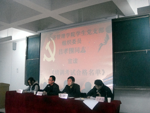 2011年12月21日,山东英才学院经济管理学院“第十五期入党积极分子培训结业典礼”在教学楼100教室隆重举行。出席本次仪式的领导有经济管理学院党支部宣传委员、基层团委书记王鹏飞,经济管理学院党支部组织委员王栋栋,经济管理学院学生党支部组织委员、基层团委副书记、学生会主席吕孝围以及宣传委员姚瑶。经济管理学院第十五期入党积极分子参加了典礼。王鹏飞书记主持了典礼仪式。