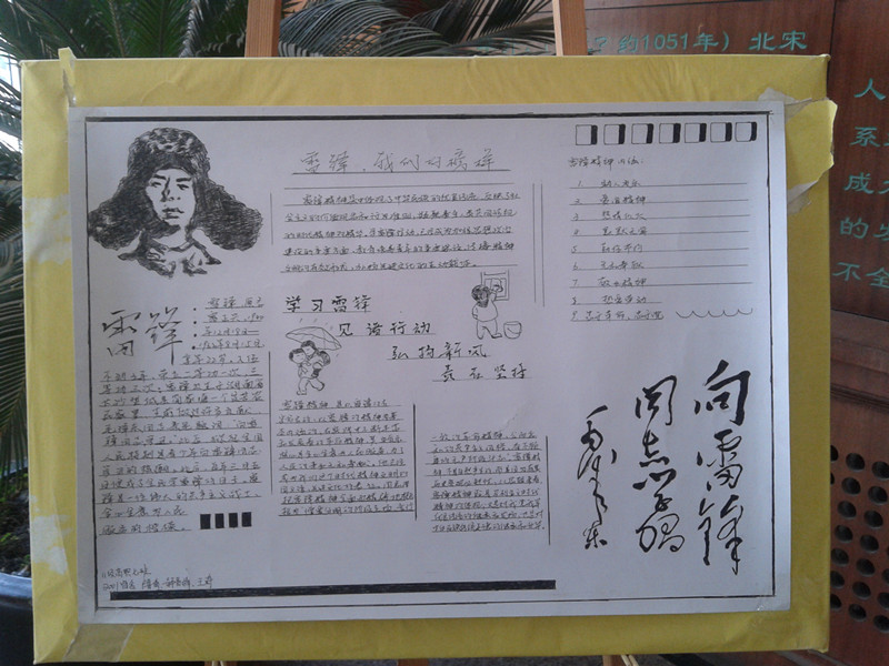 为了进一步发扬雷锋精神,寻找生命的闪光点,学前教育学院基层团委社会实践部于2012年4月6日主办了以“我心中的雷锋”为主题的展板。