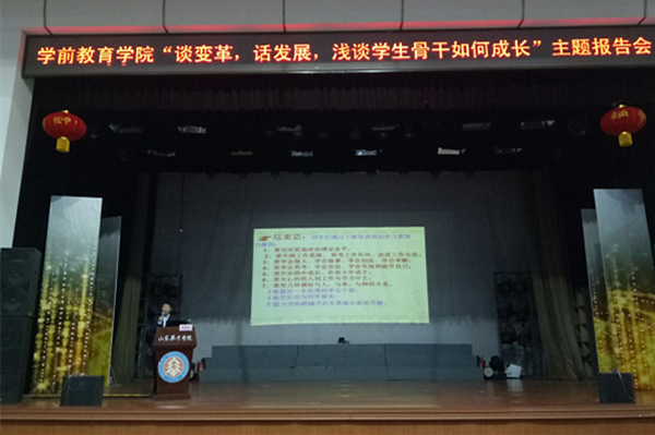 为提高我院学生干部的政治素养和工作能力,进一步发挥团学干部的先锋模范带头作用,促进我院学生组织和班集体的发展和建设,学前教育学院于2016年4月1日中午12时,在大学生活动中心召开了“谈变革,话发展,浅谈学生骨干如何成长”报告会,会议由学前教育学院党总支书记王冠良主持,副院长郑雯,基层团委书记王坤丽,行政秘书曹鹏,以及各级辅导员,基层团委学生会骨干和各年级班级骨干均参加了此次会议。