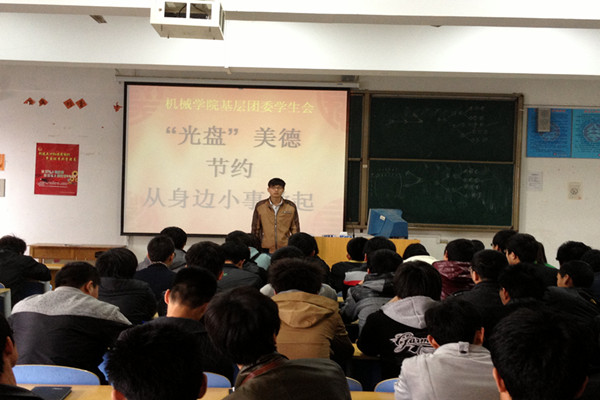 机械学院基层团委学生会积极响应上级和学院团委“光盘行动”的号召,4月3日在实训北楼举行“光盘行动”动员大会,参加此次大会的有机械学院基层团委学生会各副主席、各部长以及全体学生干部,大会由机械学院基层团委学生会主席任诗举主持。