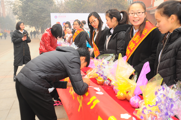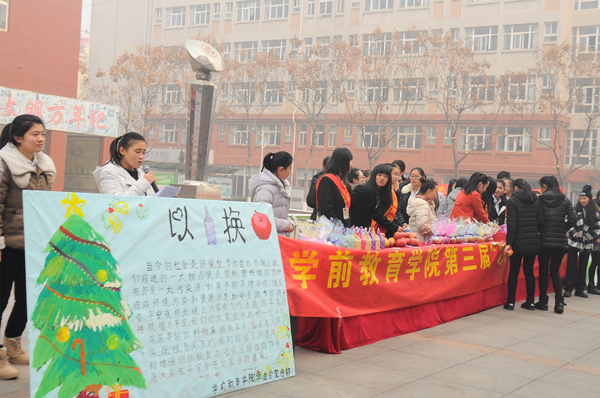 为提高大学生的环保意识,提醒大家废旧物品再循环利用、保护环境、节约资源, 2015年12月23日中午11点,由学前教育学院主办的“以瓶换苹”大型环保活动在大学生活动中心前正式举行。学前教育学院辅导员老师张维,学生会主席李林,学生会副主席杨磊,宿管会主席庄广雁,以及基层团委办公室主任马林清等各个基层团委学生会部长和外联部的全体成员参与了本次活动。