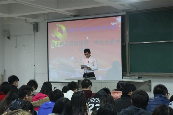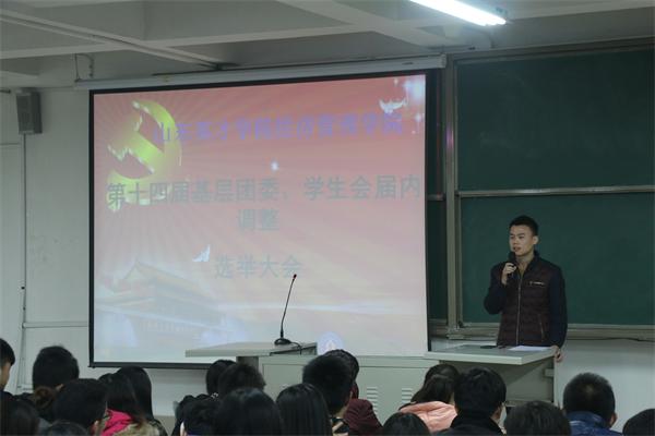 为更好的服务广大师生,促进学生管理工作的发展, 2015年12 月23日,经济管理学院在经管楼B-100教室召开了基层团委、学生会界内调整换届选举大会。学生会主席杨鑫及副主席郝文笑、徐文正,何晓慰、任佳芳出席会议。