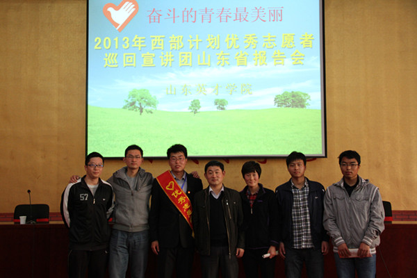 4月7日,“奋斗的青春最美丽”2013年西部计划优秀志愿者巡回宣讲团山东省首场报告会在我院学术报告厅隆重举行。共青团新疆自治区委志愿者工作部孙宏俊、共青团山东省委志愿者行动指导中心主任刘北雪、共青团山东省委志愿者行动指导中心张阳、山东英才学院党委书记、院长夏季亭、山东英才学院副院长李崇银、团委书记龙新良、团委副书记王东生出席报告会,机械学院近40名即将毕业的学生听取了报告。