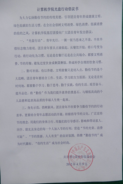 光盘行动是指就餐时倡导人们不浪费粮食,吃光盘子里的东西,吃不完的饭菜打包带走。2013年1月16首先由腾讯微博认证用户徐侠客(国土资源报副社长)在腾讯微博发起“光盘行动”,倡导网友珍惜粮食,加入行动。微博一经发布得到蔡奇、王郁松等名人和人民日报、国土资源报等媒体的支持,1月22日《新闻联播》报道该活动,号召大家节约粮食、从我做起。计算机学院基层团委发起光盘行动就是响应社会号召、提升团员青年素质的一个行动。此次光盘行动的开展是在日常团学工作基础上的又一次延伸,将团学工作教育青年、提升青年的功能深化到团员青年的生活当中,通过团员青年生活中的一点一滴来提升团员青年的基本素质,为社会的优良风气的形成尽一份力量,为社会的发展尽一份责任。计算机学院基层团委在提出进行光盘行动的同时,也发出了光盘行动倡议书,在广大普通同学中广泛宣传,以期共同营造一个节约型的青春校园。