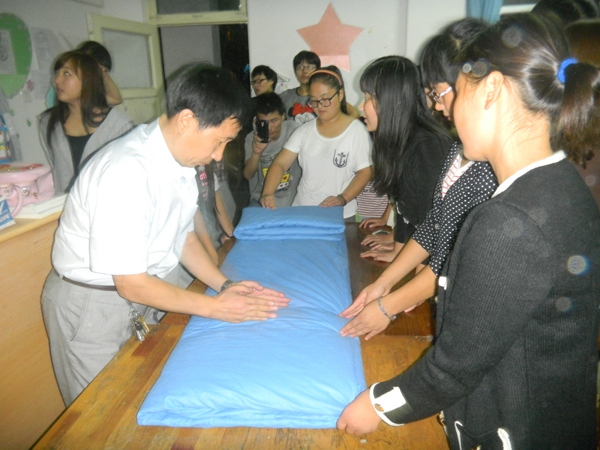 最后,郭院长亲自指导学生叠军被,和同学们一起叠被子。在他那慈祥的背影和熟练的叠被手法当中,处处体现着一位老军人的风采,赢得了同学们阵阵掌声。同学们对郭院长的亲临指导和鼓励表示由衷的感谢。我们坚信一定会把医学院学生的寝室建成温馨、向上、和谐的学生之家。