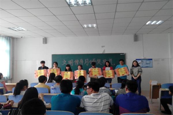 为了教育和引导学生自觉树立良好形象,引导学生养成健康文明的生活习惯和行为方式,提高大学生文明素质与修养水平,推进和谐、文明校园建设。信息工程学院于2014年4月份举办“大学生文明修身月”主题教育活动,为了表彰在此次活动表现突出的班级和个人,信息工程学院于2014年5月7日12:00在B5007举行了“文明修身月”的颁奖典礼。出席本次颁奖典礼的嘉宾有信息工程学院基层团委书记米晓青、导员代表杜春茂老师以及基层团委各部长。由基层团委副书记张运清主持本次颁奖典礼。