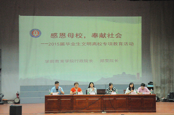为了加强宣传教育,组织座谈交流,开展特色活动,进一步加强毕业生与学校、学院之间的感情,学前教育学院于5月8日中午12:00在大学生活动中心开展了以“感恩母校,奉献社会”为主题的2015届毕业生文明离校专项教育活动,出席的领导有学前教育学院行政院长郑雯、基层团委书记王坤丽、行政秘书曹鹏、沈汉斌、就业秘书卢玮、韩晓璐。会议由行政秘书曹鹏主持。