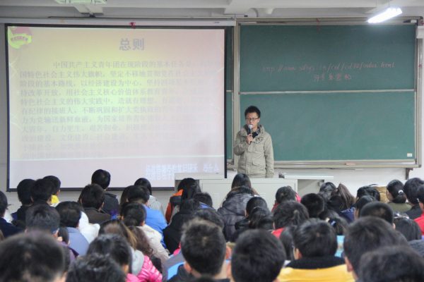 在与会人员激昂高亢的《中国共青团歌》声中本次新团章学习活动正式拉开帷幕。大会开始,王鹏飞书记首先代表发言,他讲到,中国共产主义青年团是中国共产党领导的先进青年的群众组织,是广大青年在实践中学习中国特色社会主义和共产主义的学校,是中国共产党的助手和后备军,因此,作为一名团学干部应有义务学好团章,落实好团章,积极做好团学工作。接着,办公室主任路宗伟正式开始本次团章学习活动。路主任借助精心准备的PPT将新团章用自己熟练的语言呈现给同学们。团章学习过程中,路主任重点强调了新团章中关于团的建设必须贯彻落实以下几个方面:(一)坚持党的基本路线不动摇;(二)坚持党建带团建;(三)坚持先进性与群众性的统一;(四)坚持把竭诚服务青年作为团的一切工作的出发点和落脚点,更好地吸引和凝聚青年;(五)坚持民主集中制;(六)坚持不懈地抓好基层建设。通过路主任的讲解,使得同学们更加深刻的明白学习团的基本知识和团的光荣传统,了解团的性质、任务,团员的权利、义务和团内各项规章制度是增强团员意识教育活动的一部分。最后,伴随着嘹亮的《中国共青团团歌》,本次新团章学习活动圆满结束。