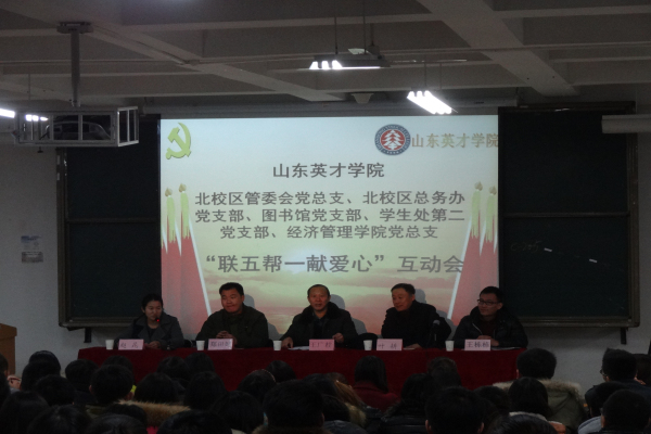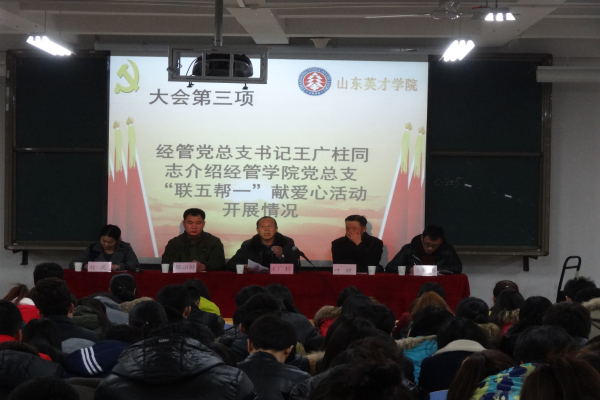 根据学校党委年度工作安排,为继续深入开展“联五帮一献爱心”活动,切实发挥好党员的先进性,把党的温暖与关怀献给学生。2015年1月8日12时,经济管理学院在教学楼B-100教室召开“联五帮一献爱心”互助会 。图书馆党支部叶耕老师、学生处第二党支部书记郑田好、经济管理学院党总支书记王广柱、经济管理学院行政党支部委员王栋栋、经济管理学院学生党支部书记赵昆携经济管理学院全体党员出席会议,经济管理学院受助学生和各班部分同学参加此次会议。本次会议由学生党支部书记赵昆主持。