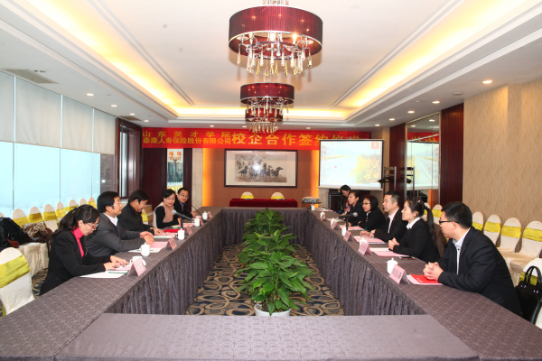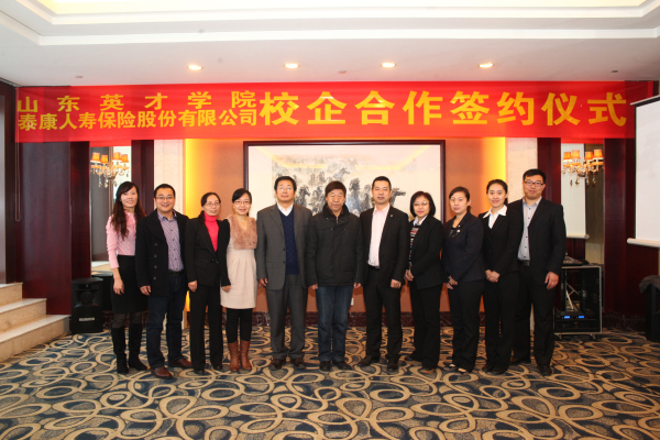 2013年12月6日 我校与泰康人寿保险股份有限公司签约仪式在山大学府交流中心会议厅举行隆重举行。学校副院长王兆良教授、副院长刘存刚博士、就业指导与校企合作处处长乔晓萍、经济管理学院副院长李众宜副教授、副院长杜志玉等校方代表与泰康人寿保险股份有限公司山东分公司人力资源部许国松总经理、李瑶晖总经理、招聘主管韩发森等企方代表共同出席签约仪式,签约仪式由乔处长主持。