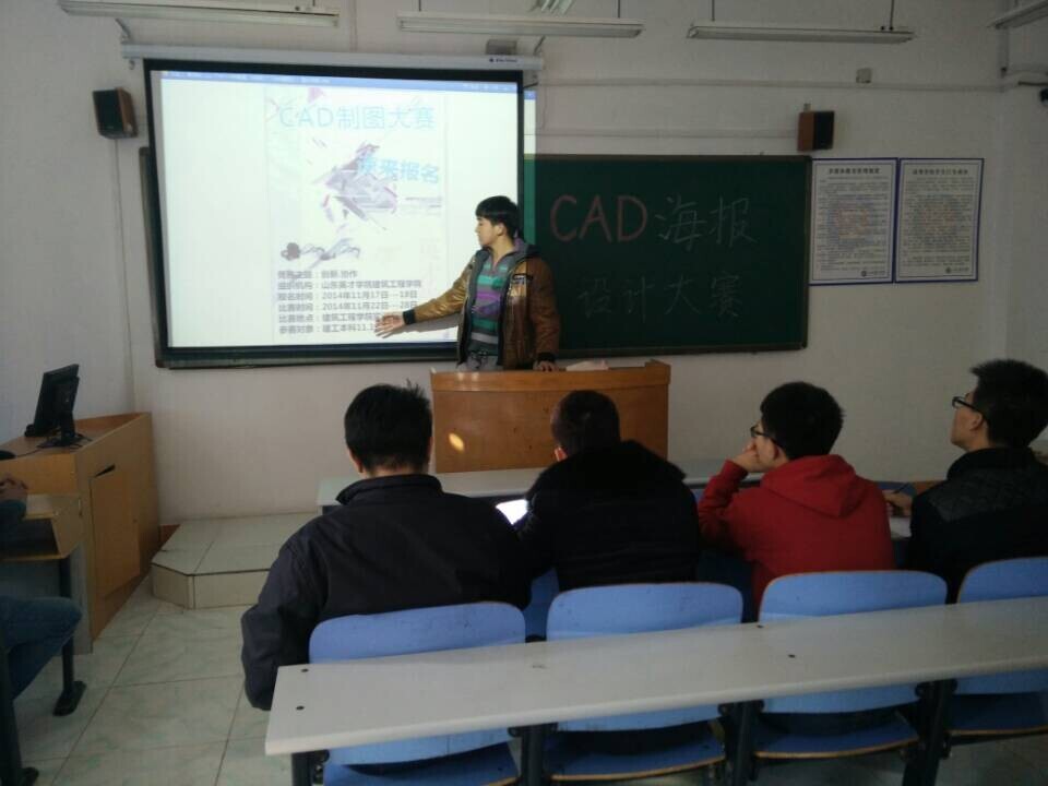 2014年12月18日中午12点,由建筑工程学院学生会权益部主办的“CAD海报设计大赛”评选在C楼如期举行。本次评选由权益部部长隆海峰主持,参与此次评选的评委有建筑工程学院学生会分管主席以及权益部、学习部、宣传部、安全部各部长。