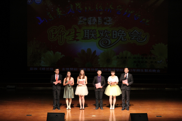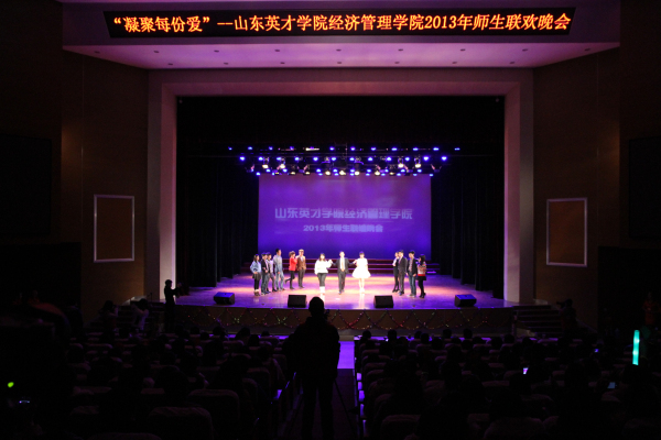 这是歌的世界,这是舞的海洋,师生同聚一堂,共度美好青春、温馨夜晚。2013年12月18日下午18时,“凝聚每份爱”经济管理学院2013年师生联欢晚会在北校区大学生活动中心隆重举行。山东英才学院副院长王兆良教授、张宗胜教授,经济管理学院党总支书记、院长刘超、副院长王广柱、李众宜、杜志玉,全体辅导员老师与经管学子共享盛宴。