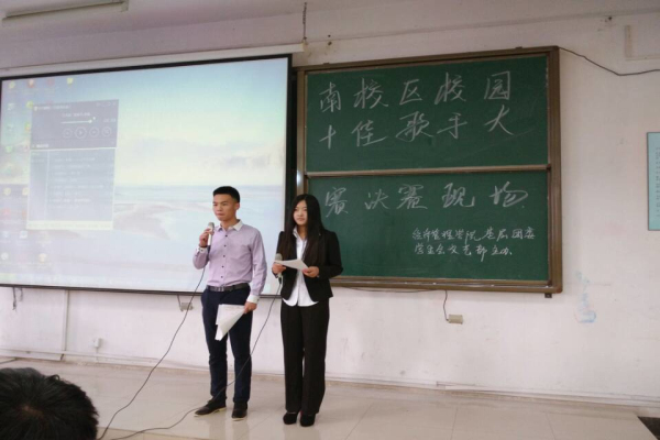 11月6日,经济管理学院南校区基层团委学生会文艺部在综教北楼1015教室举办了校园十佳歌手大赛决赛,经济管理学院南校区行政院长张永禄、辅导员王文杰、王潇潇、张林飞,团委副书记甄华国以及文艺部副部长韩佩锦、李清浅作为应邀评委出席了本场大赛。
