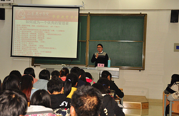 这次骨干培训的主要围绕“如何当好学生干部”这一主题展开,到场的同学都认真听讲,积极回应老师。一段训练有序的生活服务中心的团队展示表演拉开序幕,他们展现出的团队精神感染着在座的每一位骨干。首先,曹老师从“我为什么要当班干部”开始讲解,他用幽默、平实的话语分享了自己在学习、社会实践中遇到的一些趣事和对待困难的乐观看法,使骨干们明白“凡事发生太棒了,美好的事物总值得期待”。他告诫同学们要想当好一名合格的学生干部就要学会先做人后做事,对国家、学校、自己都要忠诚。其次,曹鹏老师着力强调“心态是根”,他分别从个人、领导,父母,爱人等方面讲,对象不同,则心态不同,处事风格也要随机应变,这样才能成为合格的学生干部。作为一名管理者,首先必须完善自己,提高自身道德素质,处理好自己学习与工作的关系,用独特的方式去管理别人,更要明白自己的职责,努力创建优秀的团队。曹老师要求,作为一名学生干部必须要做到守时守纪、以身作则、严谨自律和主动积极;还要提高大胆创新和为人处事的能力。他的一番精彩演讲使学生骨干们清晰地认识到自己的工作职责,学会了更多的管理技能,增强了对未来不懈追求的信心和勇气。
