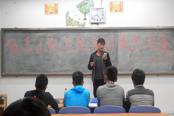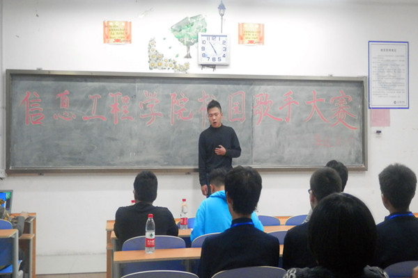 为了丰富校园文化生活,努力营造积极向上、格调高雅、健康文明的校园文化氛围,加强学院精神文明建设,展示我院学生团结创新、积极进取、蓬勃向上的精神风貌,用声音感动校园,信息工程学院于2014年11月2日在b楼3005教室举办校园歌手大赛。大赛出席的嘉宾有文艺部部长王春晖,艺术团团长李景宗