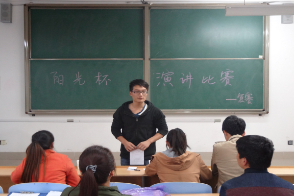 2014年10月29日,经济管理学院“阳光杯”演讲比赛复赛在B-404举行,参加本次活动的人员主要有通过初赛的各班级参赛代表,由学生会副主席、办公室办公室主任、科技创新部及学习部部长作为特邀评委嘉宾。