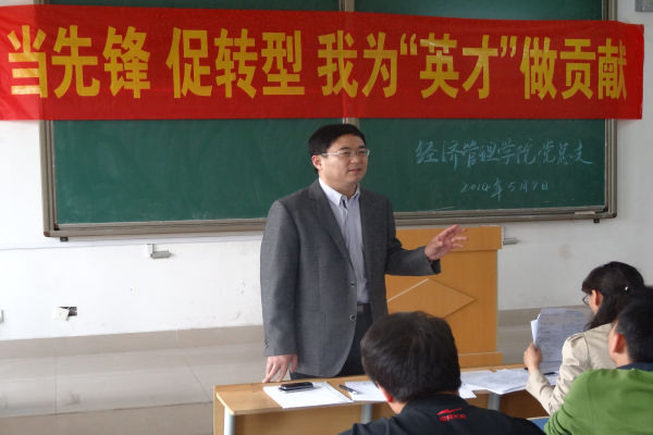 刘超书记做重要讲话,并对“当先锋、促转型,做贡献”活动提出明确要求。刘超书记强调,每位党员同志务必高度重视此次活动,要将讲党性与经济管理学院可持续发展紧密联系在一起,党员同志只有讲党性、讲政治才能有长远发展,要时刻严格要求自己,不断提高自身政治素养,不断深化对党组织性质与目标的认识;要求在此次争先锋做贡献的活动中,党员要起先锋模范作用,要深入思考如何发挥党员的模范带头作用,各教学、行政、学生党支部要结合工作实际进行评比和相互促进,力争在活动中创先争优。党员同志还要积极发现、鼓励和引导周围优秀分子申请加入党组织,不断壮大党员队伍,发展党员力量。