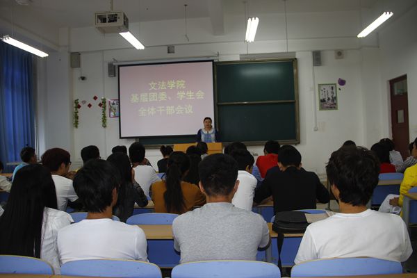 2014年9月29日中午12点,文法学院在A楼301教室召开基层团委、学生会全体干部会议。文法学院基层团委书记吴艳及全体学生会