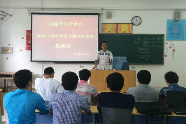 为广泛开展青年意识和道德教育,提高青年思想道德素质,培育和践行社会主义核心价值观,机械学院基层团委、学生会于2014年9月21日在实训北楼4003教室召开了“我眼中的社会主义核心价值观”恳谈会。本次恳谈活动由机械学院学生会副主席姚毓忠主持。