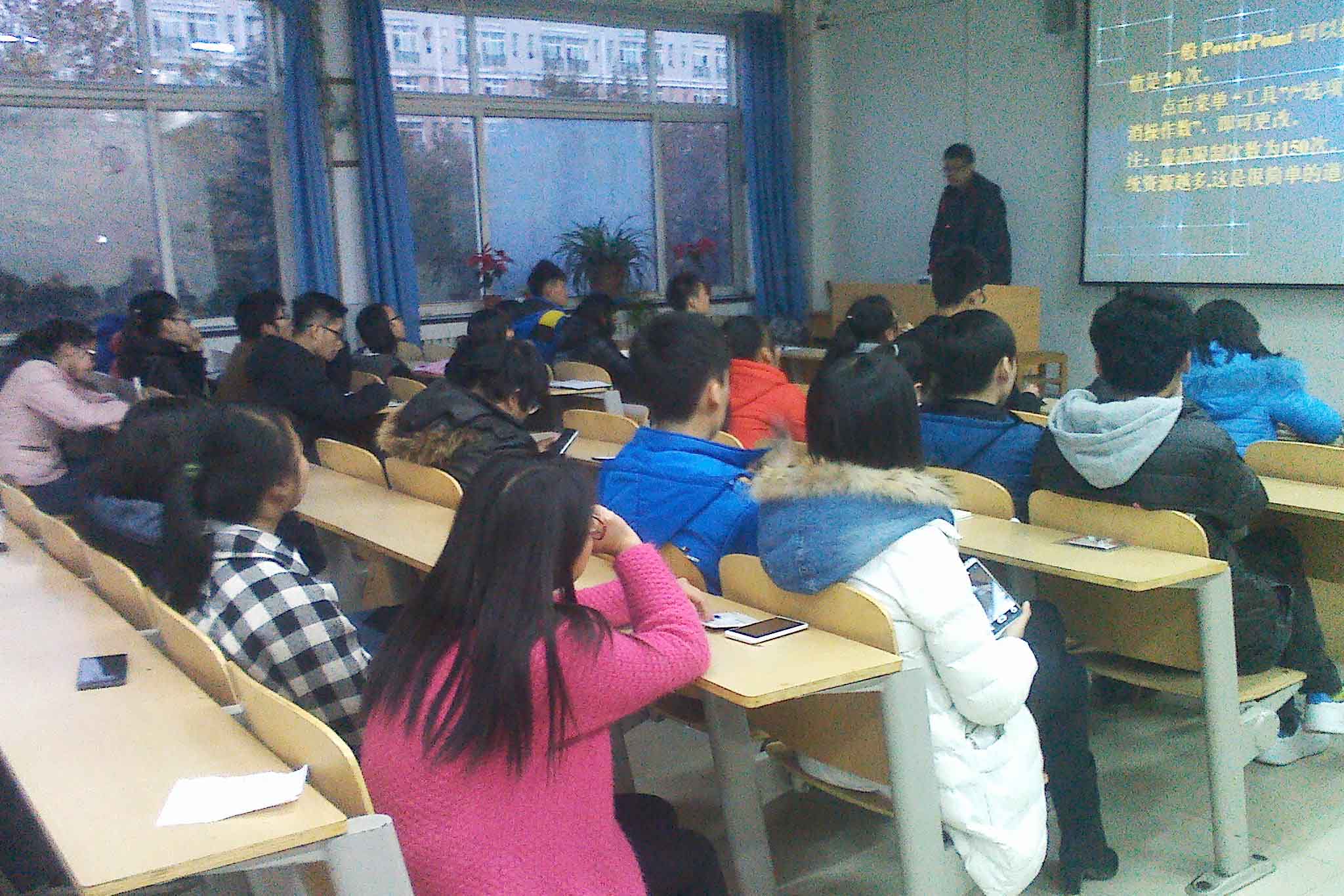 2014年11月13日星期四下午5点在宗教北楼1011上例课,由技术部房政金学长为全体社员们讲解关于PowerPoint的使用技巧。