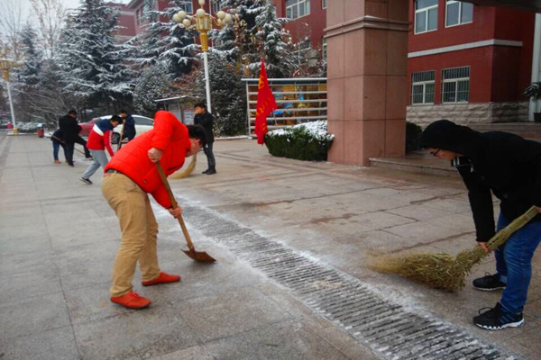 历时半个小时,清扫工作完成。尽管此时气温在零下,大家的脸和双手已冻的通红,但大家的脸上都有着为师生服务后的满足感。