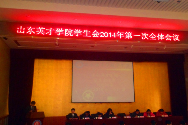 会议在雄伟庄严的国歌声中拉开了序幕。接着,校学生会副秘书长李婧雯宣读山东英才学院学生会现任学生干部任职情况。随后,校学生会主席刘超发言,宣读《山东英才学院学生会2014年工作划》,工作计划围绕“思想引领、志愿服务、校园文化、组织建设、常规工作、社会实践”等7个方面展开。并在计划中提到山东英才学院学生会一直把“团结进取,务实创新”作为工作态度。与此同时,团委组织部部长、校学生会秘书长王建洲老师在会上讲到学生干部要健康成长,“十分”优秀,应具备“四气”:一、在做事方面要有“三分傻气”;二、在为人处事方面要有“三分灵气”;三、在工作态度方面得有“三分霸气”;四、能在学生会留下并且坚持到最后就靠“一分运气”。