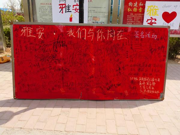 中午十二点整活动正式开始,随着人流的不断聚集,祝福在不断的汇聚,爱心也在不断壮大。“天佑巴蜀,雅安雄起。”“在灾难面前,我们都该伸出援手。我们都和雅安同胞在一起,中国地大物博完全有能力度过难关。”“看到震区同胞觉得很心酸,希望他们坚强,早日渡过难关。”这是同学们在签名时对雅安人民的祝福。随着活动的开展,越来越多的学生涌到签名条幅前,留下自己的一份祝福。活动于下午5:00结束,至此签名板上写满了同学们的签名和祝福,也表达了同学们对雅安地区满满的祝愿。