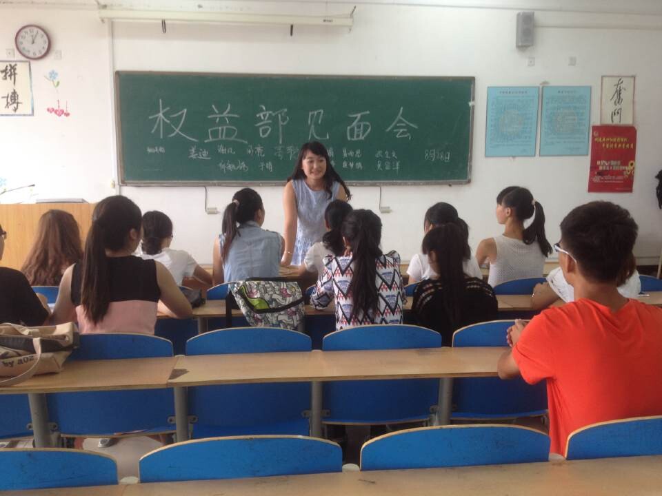 为了增加新成员之间的感情交流,让各位新成员相互熟悉,相互了解,校学生会权益部于2014年8月28日11:40在综教楼4007教室召开初试通过成员见面会。出席本次会议的有校学生会副秘书长李婧雯、校学生会副主席王永浩、权益部部长高杰、权益部13级优秀骨干王倩琳、李一妹。通过初试的14级新成员参加见面会,王倩琳主持见面会。
